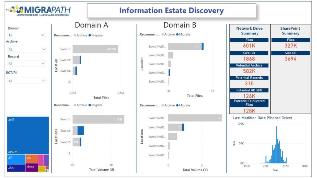 We applied MigraPath to tackle a global Oil and Gas operator’s inherited information estate, arisen from various business acquisitions, which was a mix of live and outdated information totalling over 320TB and 25 million+ files. Over 4.8 million duplicate, ROT, Archive and PII files were removed, significantly reducing the time to locate and find the right information. Combined with many other resulting benefits, we enabled informed business decisions that helped our client to make the most of their acquisitions and increase operational efficiencies.